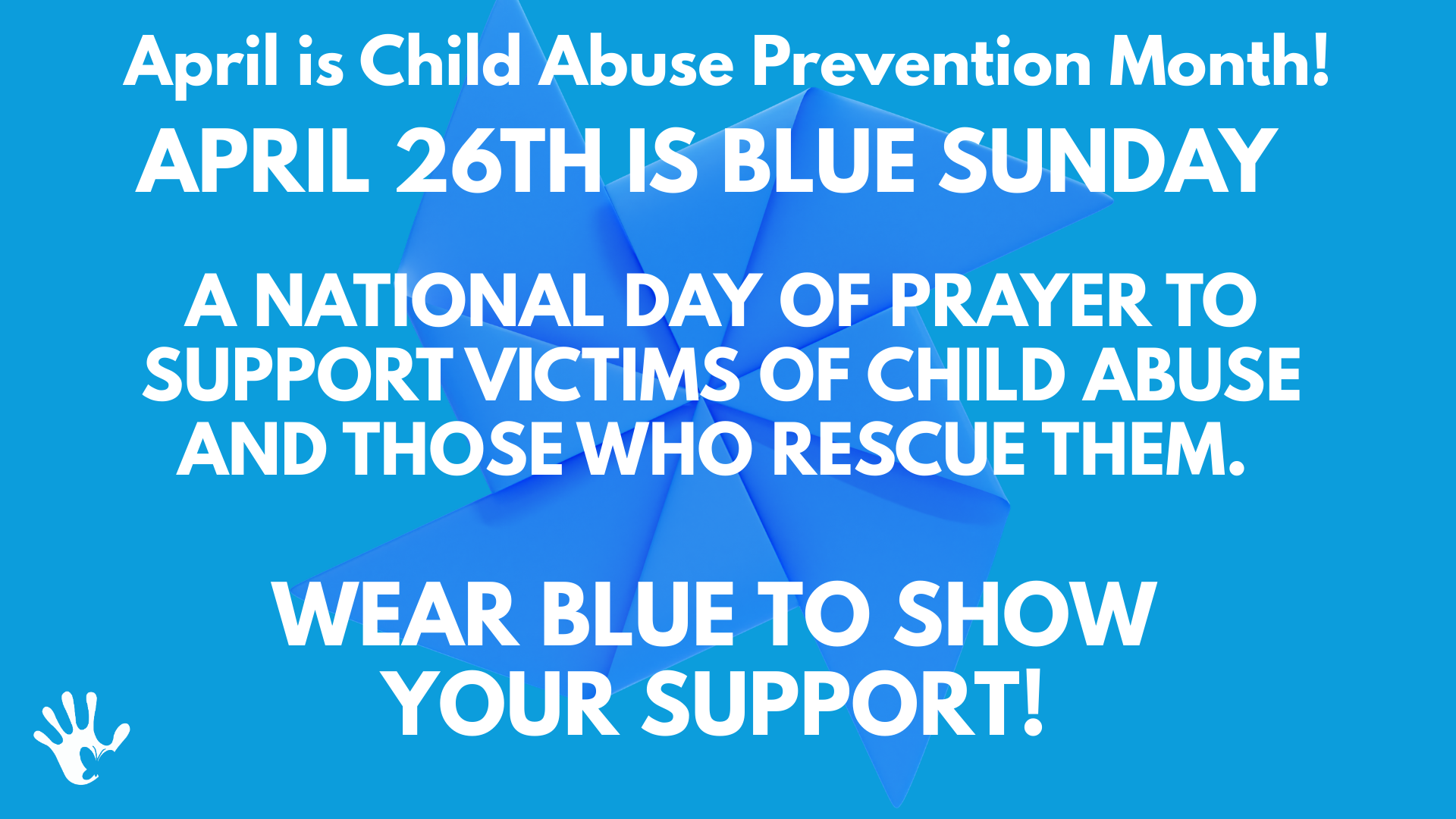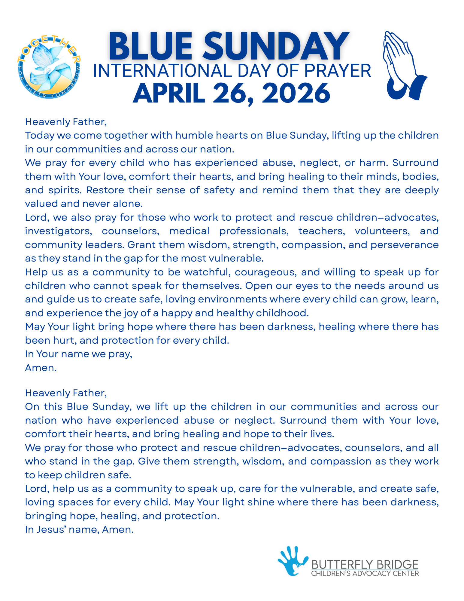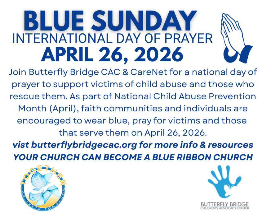 Join Butterfly Bridge CAC for a national day of prayer to support victims of child abuse and those who rescue them. As part of National Child Abuse Prevention Month (April), faith communities and individuals are encouraged to wear blue, pray for victims and those that serve them on April 26, 2026.